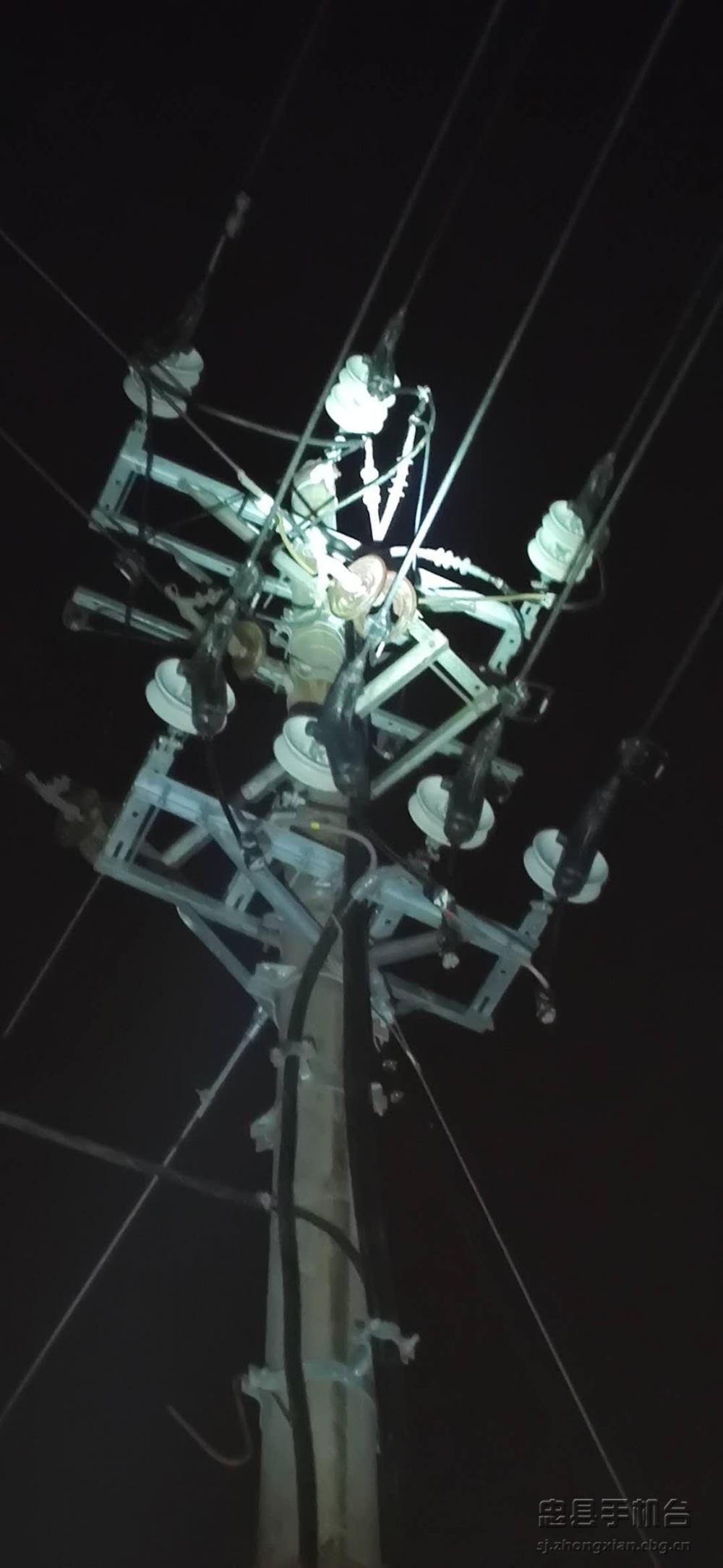 县供电公司接到抢修电话后,立即启动应急方案,快速组织人力物力赶往现场深夜抢修。该线路预计5月14日凌晨2点全面恢复正常供电。图为故障现场和抢修现场。