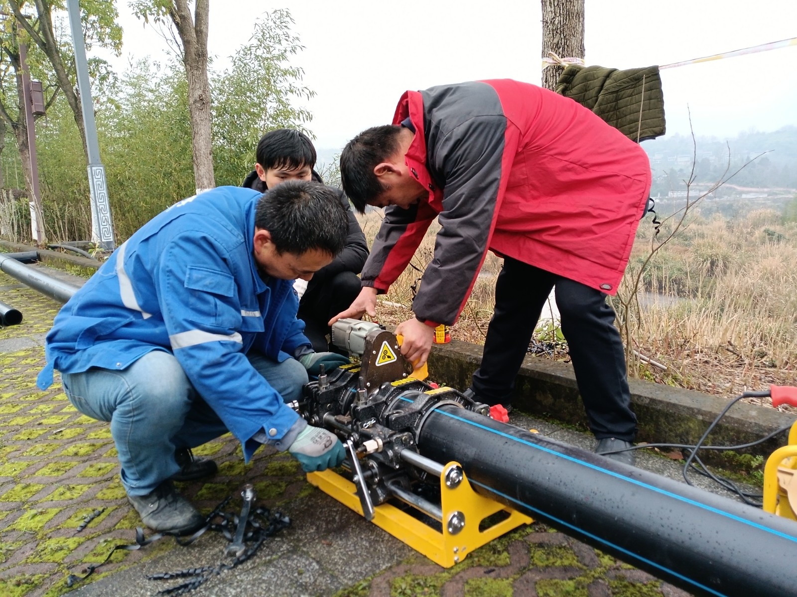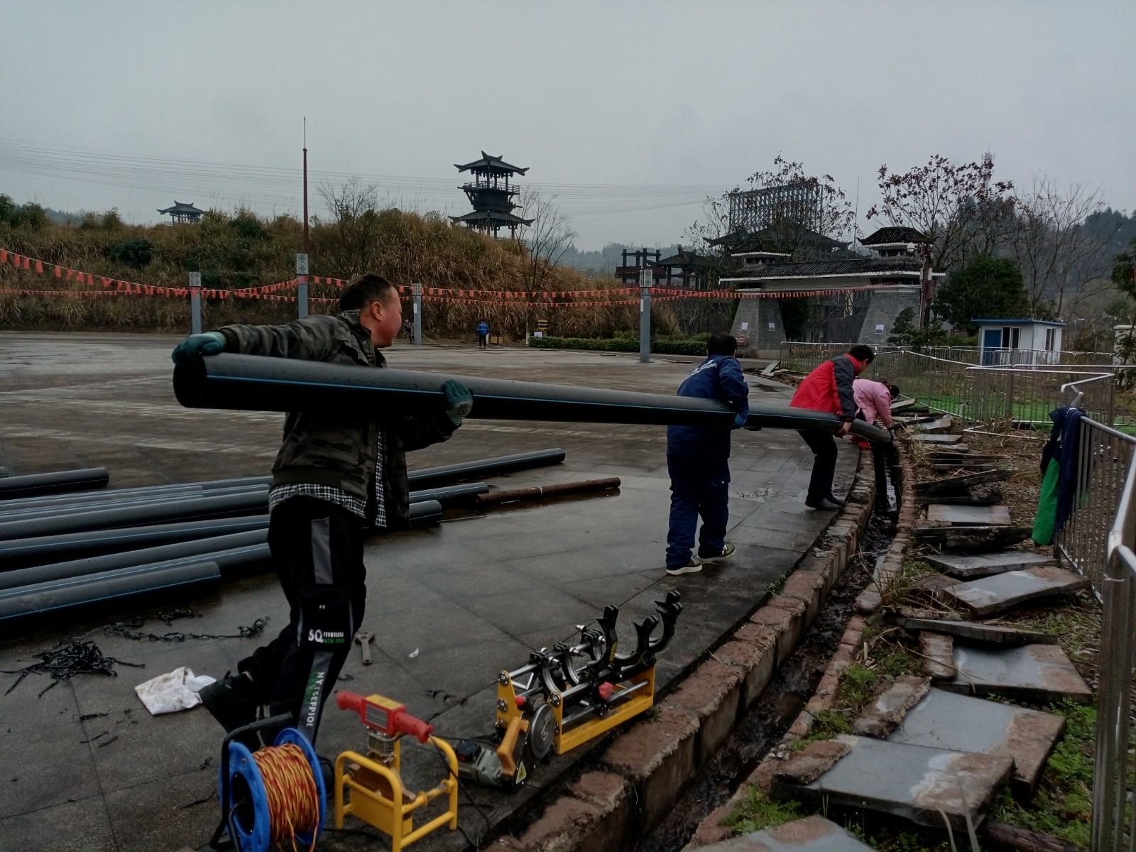 2月25日,重庆泽润水务有限公司组织10多名工人在烽烟三国景区开辟2km专用供水管道从长江取水,并安装一套现代化的超滤膜净水器,确保《烽烟三国》3月1日正常复演。