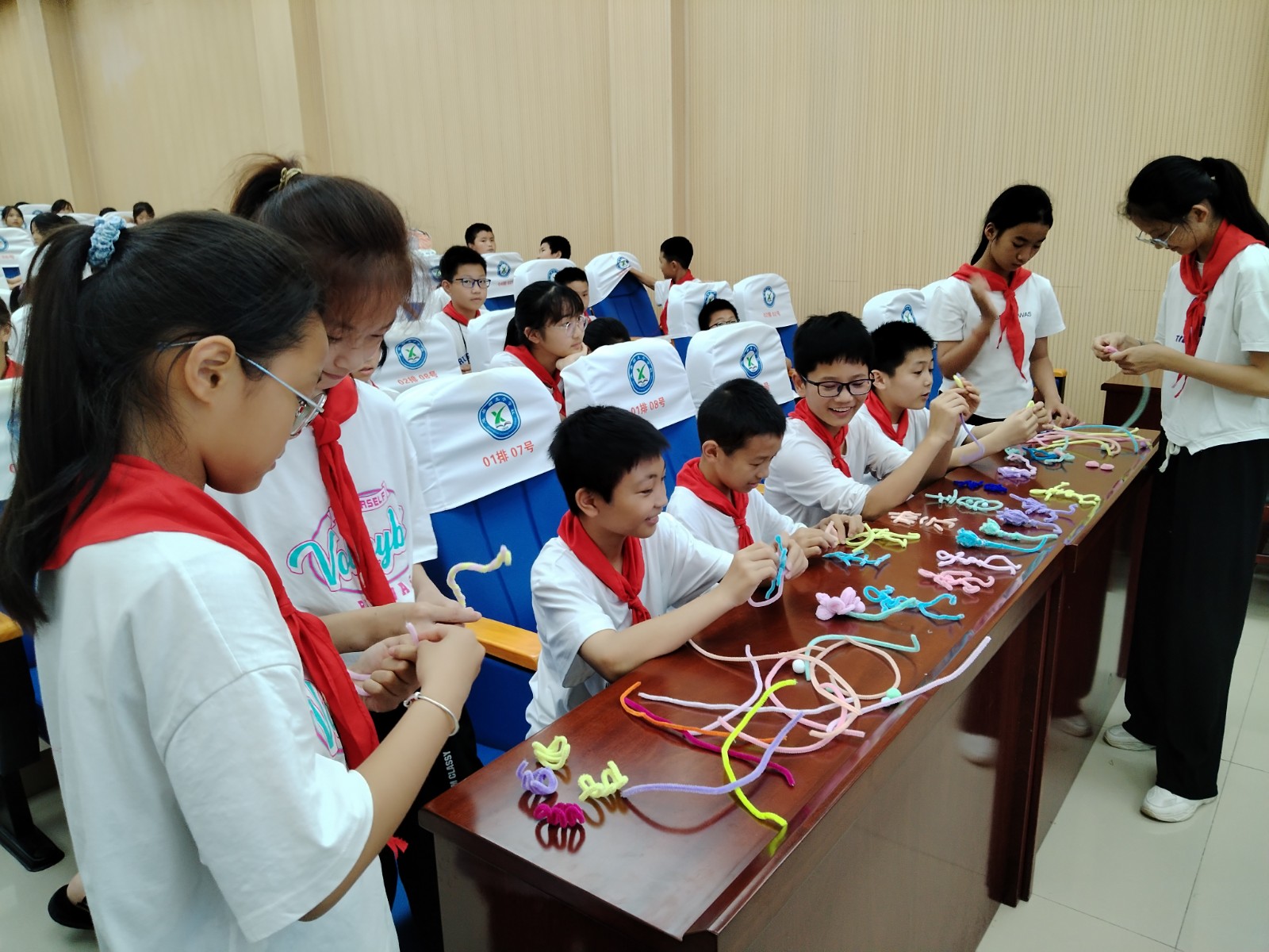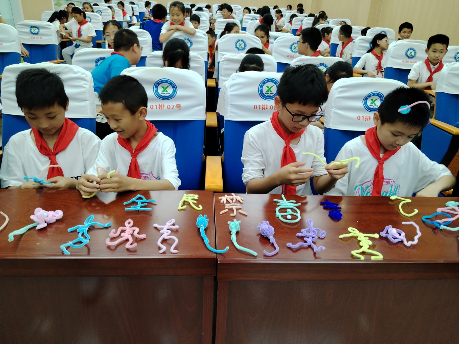 活动过程中,为更好地调动学生们的学习积极性、沉浸式开展校园禁毒宣传,禁毒社工将“创意手工”引进到禁毒教育课堂,引导学生们用“扭扭棒”制作禁毒作品。学生们通过卷、拉、剪、扭等手法,将“扭扭棒”制作成了“全民禁毒”字样等禁毒作品。